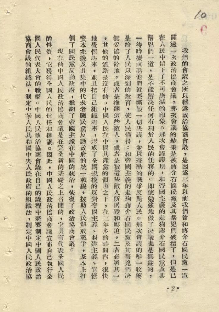 我们的会议之所以称为政治协商会议,是因为三年以前我们曾和蒋介石国民党一道开过一次政治协商会议。那次会议的结果是被蒋介石国民党及其帮凶们破坏了,但是已在人民中留下了不可磨灭的印象。那次会议证明,和帝国主义的走狗蒋介石国民党及其帮凶们一道,是不能解决任何有利于人民的任务的。即使勉强地做了决议也是无益的,一待时机成熟他们就要撕毁一切决议,并以残酷的战争反对人民。那次会议的唯一收获是给了人民以深刻的教育,使人民懂得:和帝国主义的走狗蒋介石国民党及其帮凶们决无妥协的余地,或者是推翻这些敌人,或者是被这些敌人所屠杀和压迫,二者必居其一,其他的道路是没有的。中国人民在中国共产党的领导之下,在三年多的时间内,很快地觉悟起来,并且把自己组织起来,形成了全国规模的反对帝国主义、封建主义、官僚资本主义及其集中的代表者国民党反动政府的统一战线,援助人民解放战争,基本上打倒了国民党反动政府,推翻了帝国主义在中国的统治,恢复了政治协商会议。
