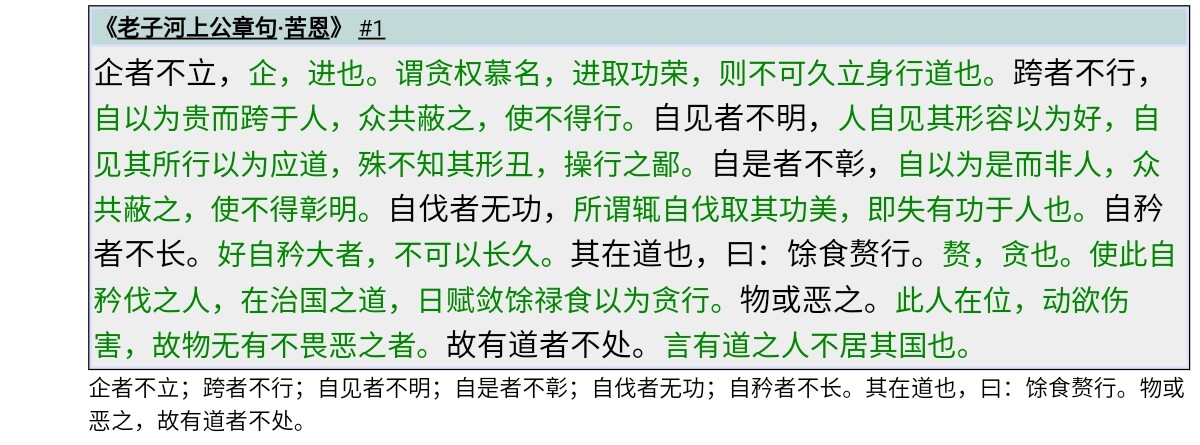 企者不立[6],跨者不行[7],自见者不明[8],自是者不彰[9],自伐[10]者无功,自矜者不长[11]。其在道也,曰余食赘行,物或恶之[12],故有道者不处[13]。(第二十四章)
