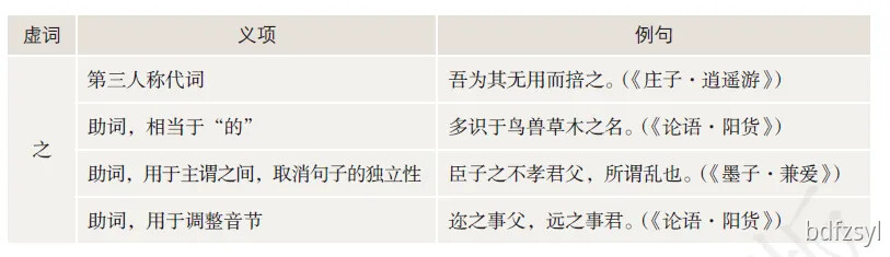三 古代汉语的虚词系统,与现代汉语有着很大的差别。“之”“乎”“者”“也”“而”“以”“其”“于”等常见虚词,在文言文中使用广泛,有着丰富的意义和用法。有意识地积累一些常见虚词,有助于培养文言语感,提高独立阅读文言文的能力。小组分工合作,找出上面列举的虚词在本单元课文中的用例,以卡片或表格的形式,整理、归纳各个虚词的意义和用法。