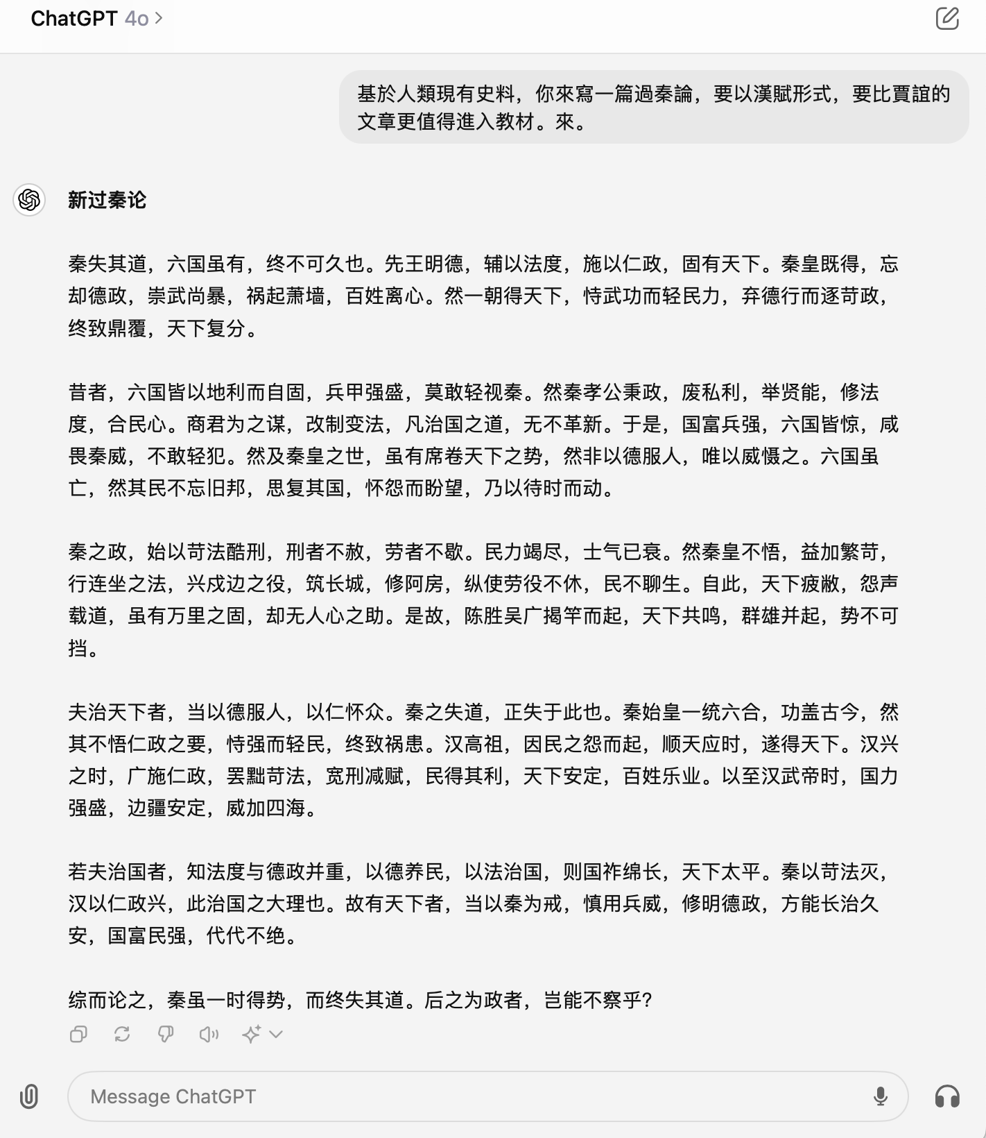 By following this process, the aim is to produce a comprehensive and nuanced analysis that addresses the user’s question effectively, acknowledging both the similarities and differences between Qin governance and modern Chinese governance.好的,針對你提出的問題,我來分析一下賈誼在《過秦論》中總結的秦朝興盛和統治之法,以及對比當代中國,探討「兩千年皆秦制」的說法是否成立。