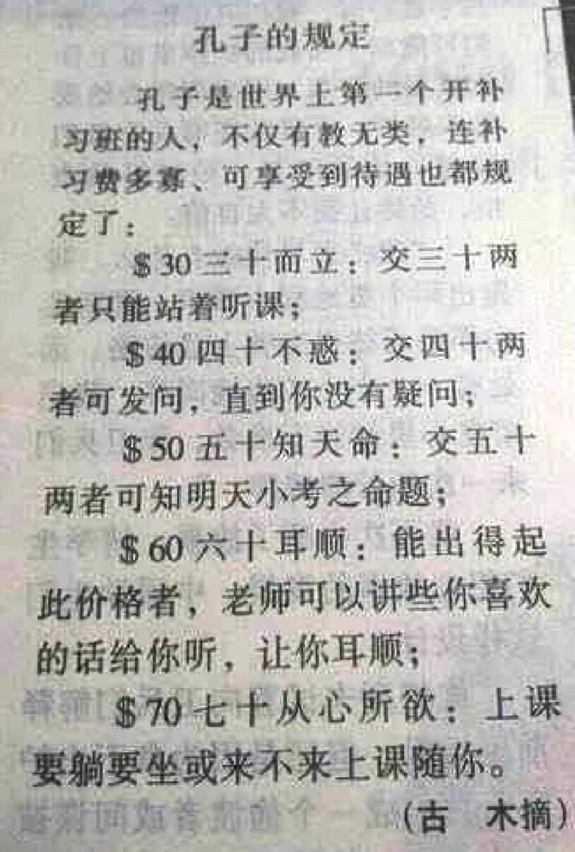 至于这“七十从心所欲”,更是滑稽。难不成到了七十岁,便可随意旷课?看来这“从心所欲不逾矩”的“矩”,也被金钱打破了!
