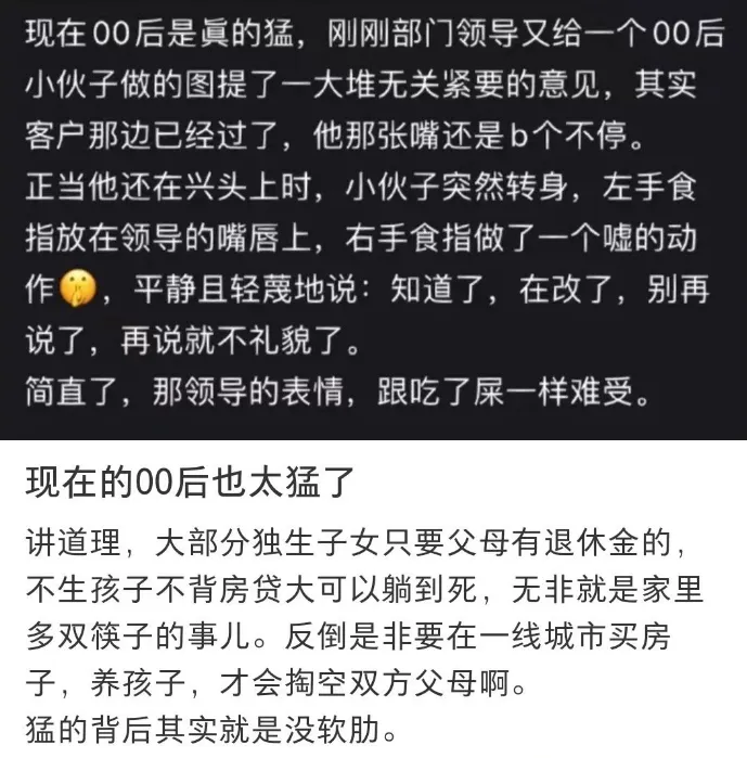 The image is a screenshot of text discussing the behaviors and attitudes of the "post-00s" generation in China, specifically regarding their perspectives on marriage, childbirth, and financial expectations. (Captioned by AI)