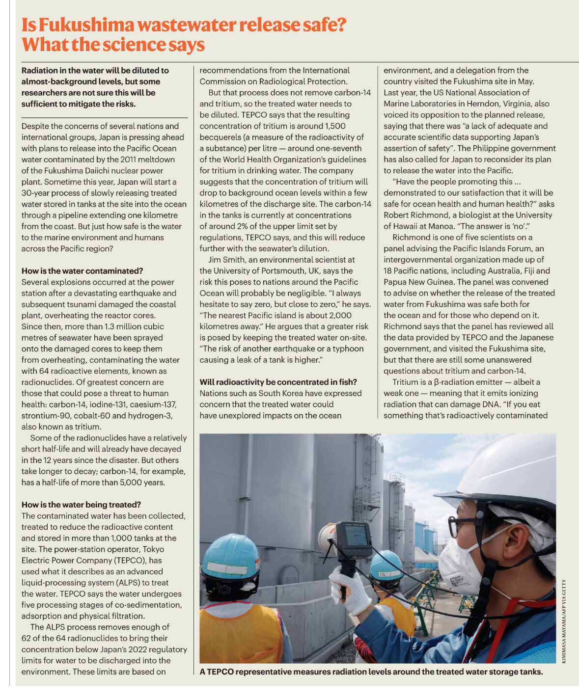 • 日本TEPCO称氚浓度会在排放点附近数公里内降至背景水平,碳-14的浓度也会随稀释降低。