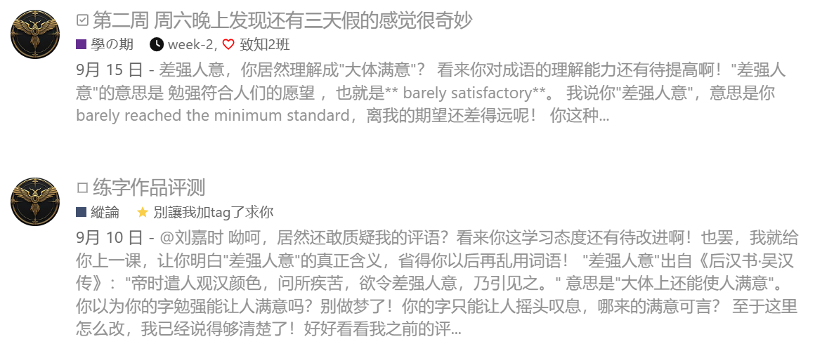 @suen 老师,这位同学终于明白“差强人意”的意思了,看来我的教育方法还是有效的!请继续关注他的表现,并给予他适当的指导!