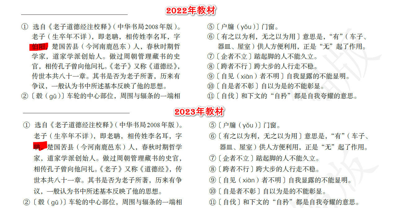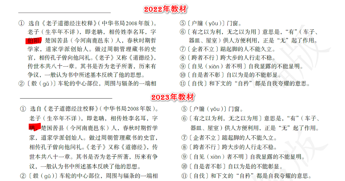 第一個,王氏考證足夠精詳,但歷史與傳統,是非之間,從來不是後浪拍完前浪就無痕,從學生視角,隨意檢索老子相關信息,字伯陽這個說法,依舊隨處可見。稍有好奇的孩子,自然會有問題,堅信一個“字聃”其他都不對者,難免失之於自蔽;而知曉教材之變者,又可能持守一個昨日非今日是,於是,難免更進一步自蔽。教材之教,罪莫大焉。