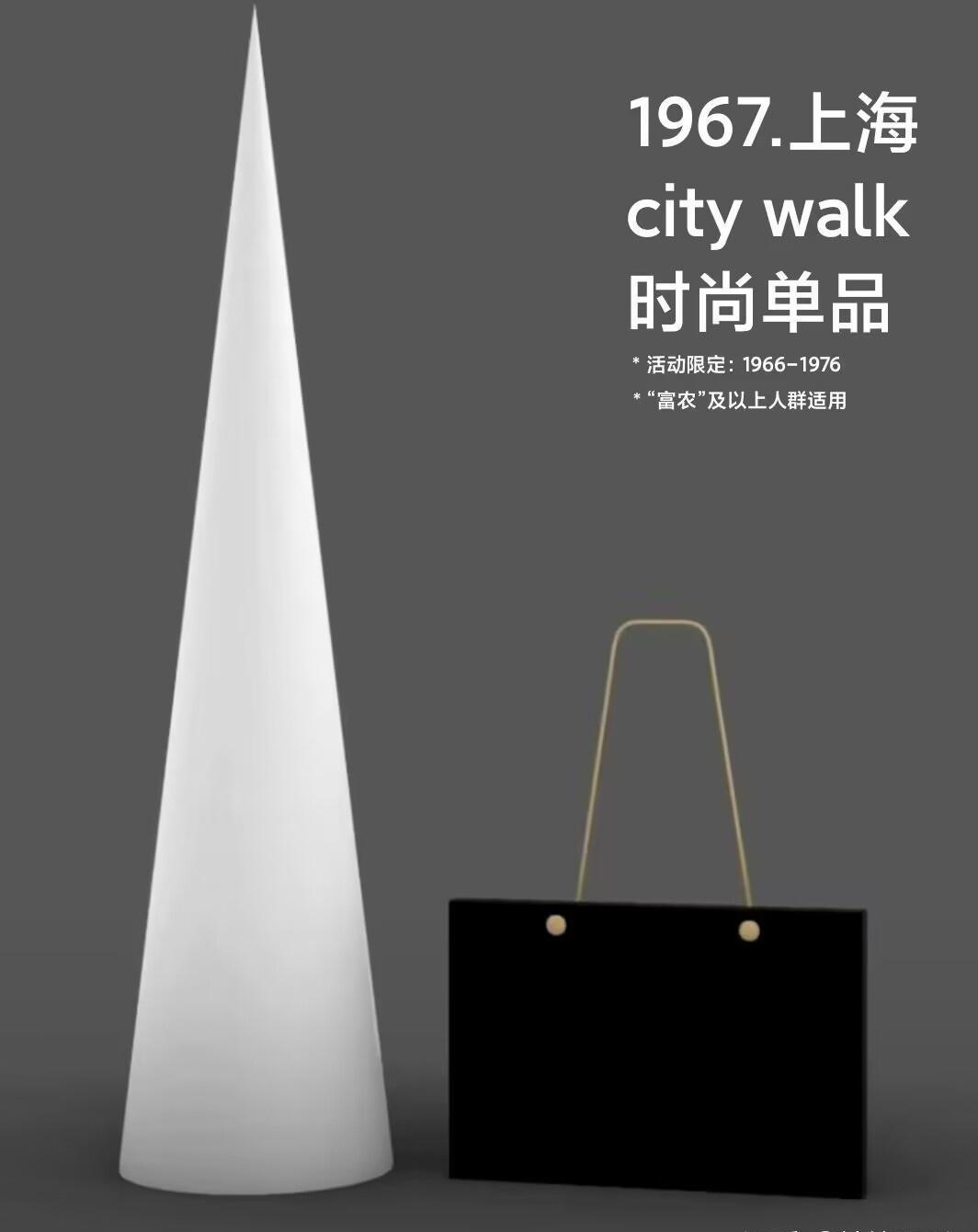 A white cone stands next to a black shopping bag with gold handles against a grey background, alongside text referencing a "1967 Shanghai city walk fashion item". (由 AI 生成标题)