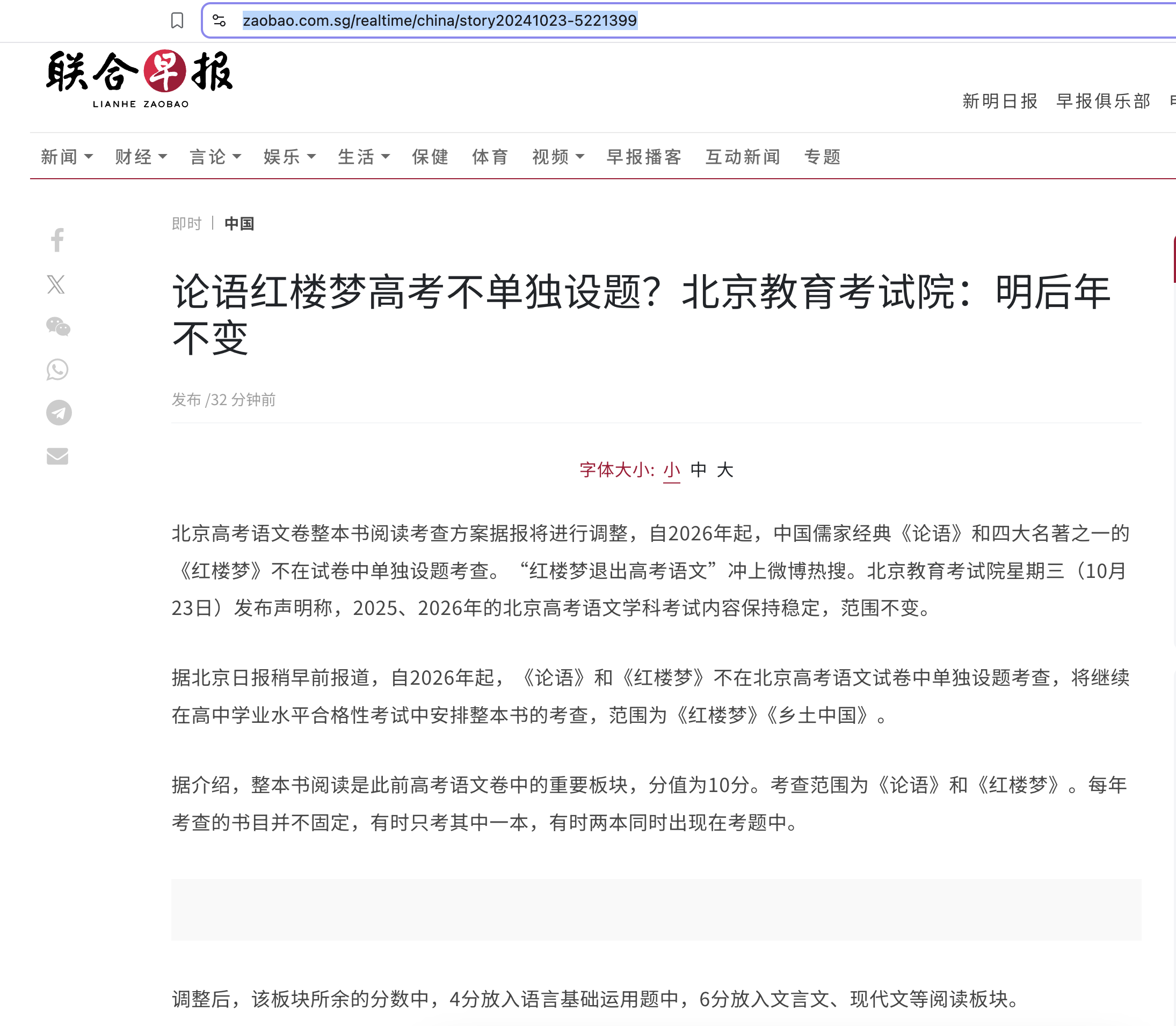 高考不考,是不是意味着学生不用再学了呢?对此,经开区高中语文教研负责人予以否认。她介绍,《红楼梦》是高中语文教材的重要单元,《<论语>十二章》是教材中一篇重要的课文。“我们读书不仅仅是为了考试,语文学科应该致力于学生语文核心素养的提升,为学生一生的发展奠基。”经开区高中语文教研负责人认为,《红楼梦》中人物塑造的手段、情节设置的技巧、语言运用的灵活等,对于提升学生的阅读与写作能力很有帮助;《论语》中的语录对于学生的精神成长、价值观的形成等也有重要启迪。
