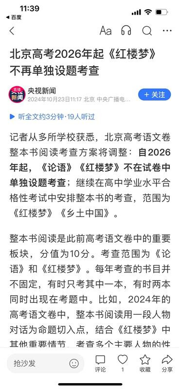 “这一调整其实为学生减了负,减轻了学生备考的压力。”经开区高中语文教研负责人说,《红楼梦》对很多学生尤其是男生来说,是个难啃的“硬骨头”。“很多男生在阅读《红楼梦》时,心理上就有些排斥,对里面描述的儿女情长、日常生活细节并不感兴趣,之前为了考试被老师逼着硬读。”她回忆,近十年来,北京高考语文卷对整本书阅读的考查一直在做减法,从最初的12本减到6本,后来减到两本再到如今的取消。