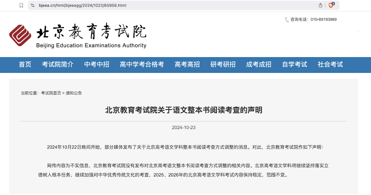 北京教育考试院没有发布对北京高考语文整本书阅读考查方式调整的相关内容