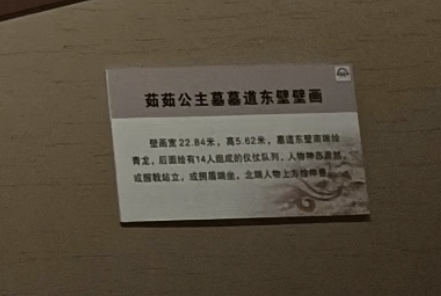 The image shows a detailed explanatory sign about the mural on the east wall of Princess Rourou's tomb passage. (AI-generated title)