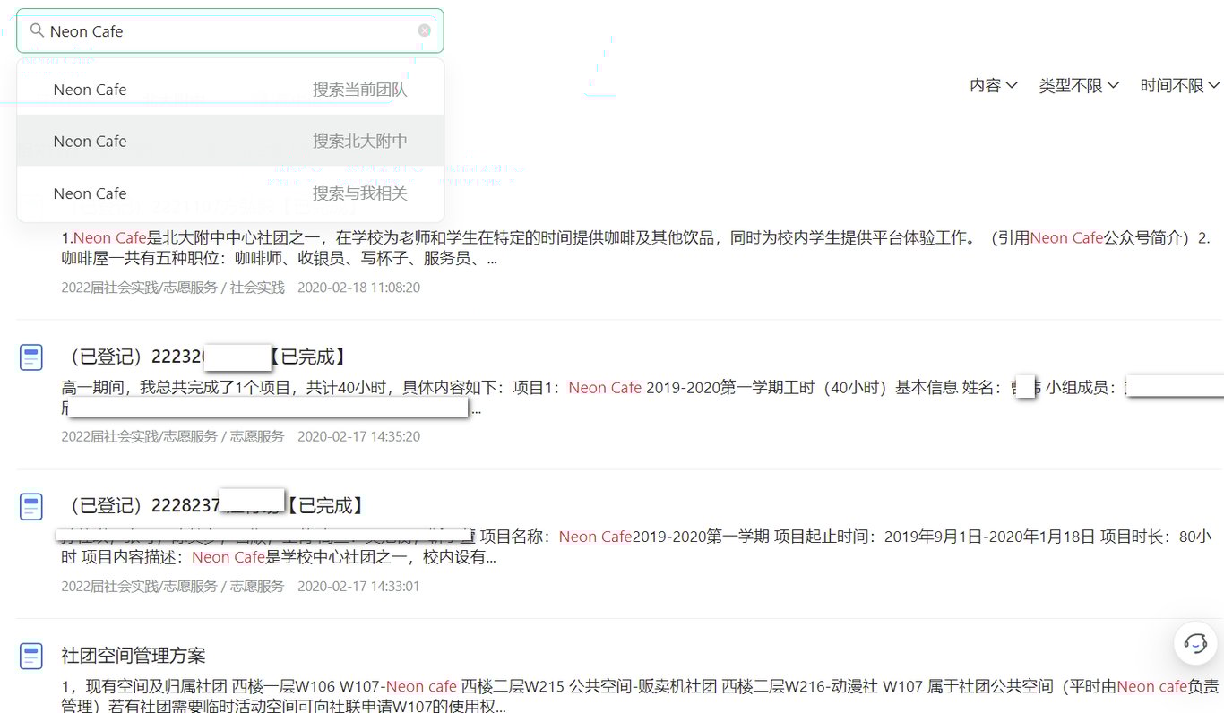 学校语雀内检索Neon Cafe,26条结果,是一个个学生的各类悲喜。