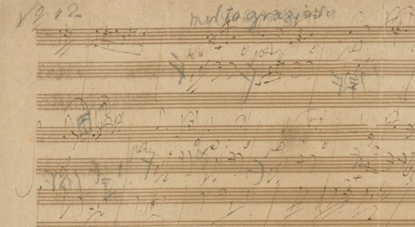 手稿隱約可見主旋律音符與字跡。(圖/Beethoven House, Bonn)