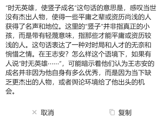 对王志安的评价:这句话暗示了回复者对王志安的某种负面评价,认为他并非真正的“英雄”,只是时势造就的“竖子”,即能力平庸或品德不高却侥幸成名的人。这反映了回复者对王志安的才能或人品持有一定的保留态度,可能认为他的影响力与其真实水平不相符。
