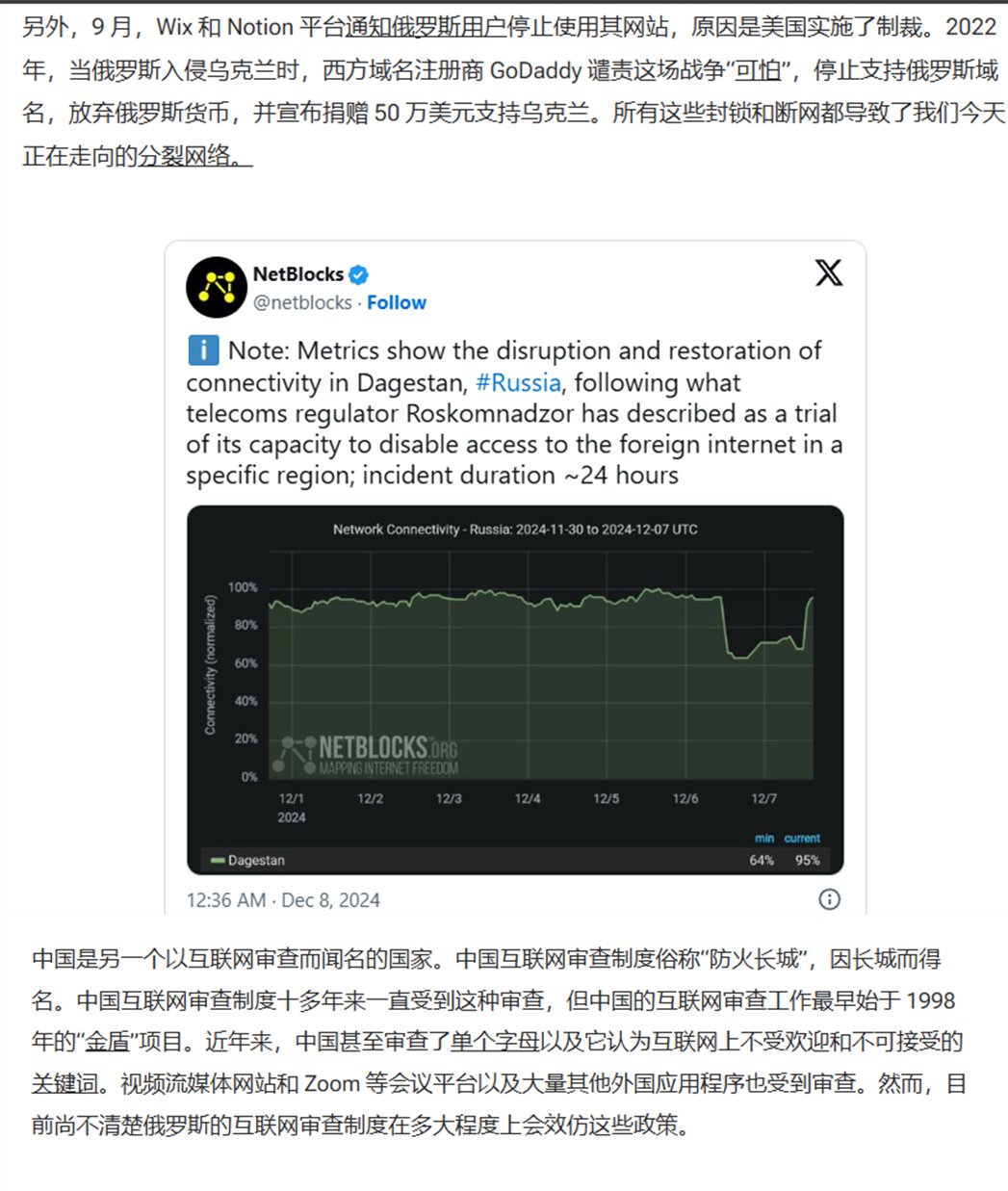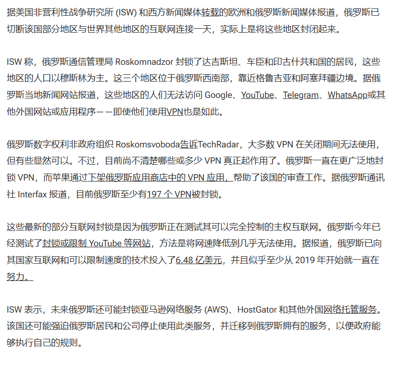 期间当地居民无法访问Google、YouTube、Telegram、WhatsApp 等外国网站和应用程序,大多数 VPN 也无法正常工作,同时继续开发自己的“主权互联网”