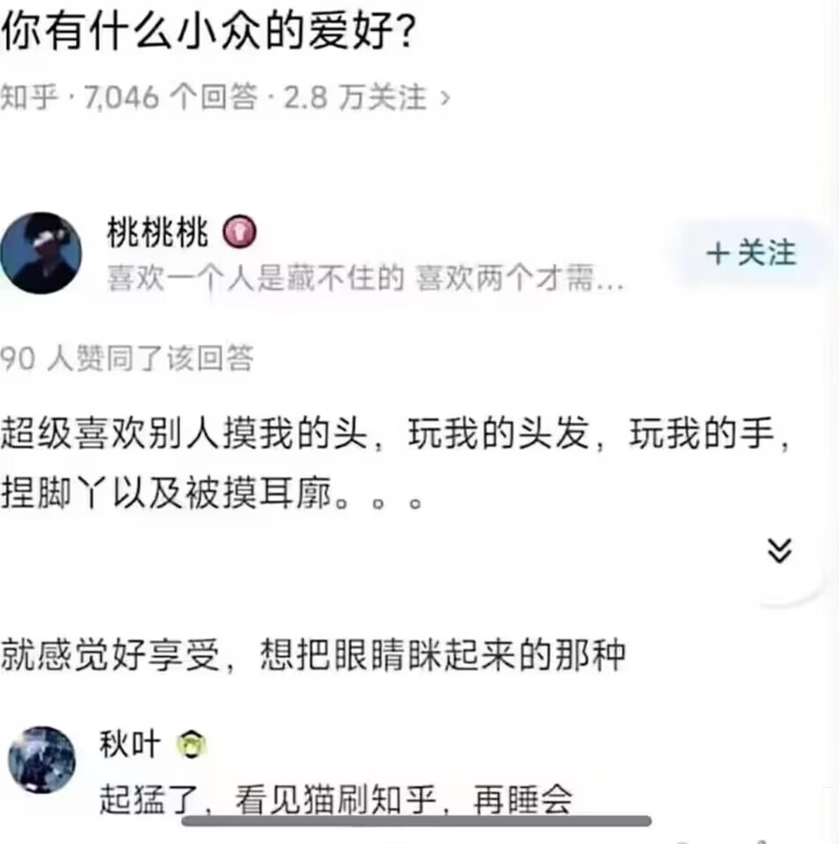 The post is about “unusual preferences” (小众的爱好). The user, 桃桃桃, states that they “super like” (超级喜欢) being touched in a variety of ways: head pats, hair playing, hand holding, foot rubs, and ear touches. The punchline comes from the user’s description of their reaction to these touches: “It just feels so enjoyable, the kind of feeling that makes you want to squint your eyes.”