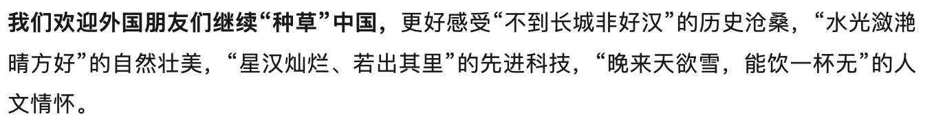 外交部的就原谅了吧,从原视频来看意境传达到了就行了。星汉灿烂,若出其里可能只是想传达灿烂辉煌吧,历史沧桑只是想点一下长城,自然点一下西湖这个人造湖泊也无可厚非,不知道是不是临场反应,如果是那真也不得了