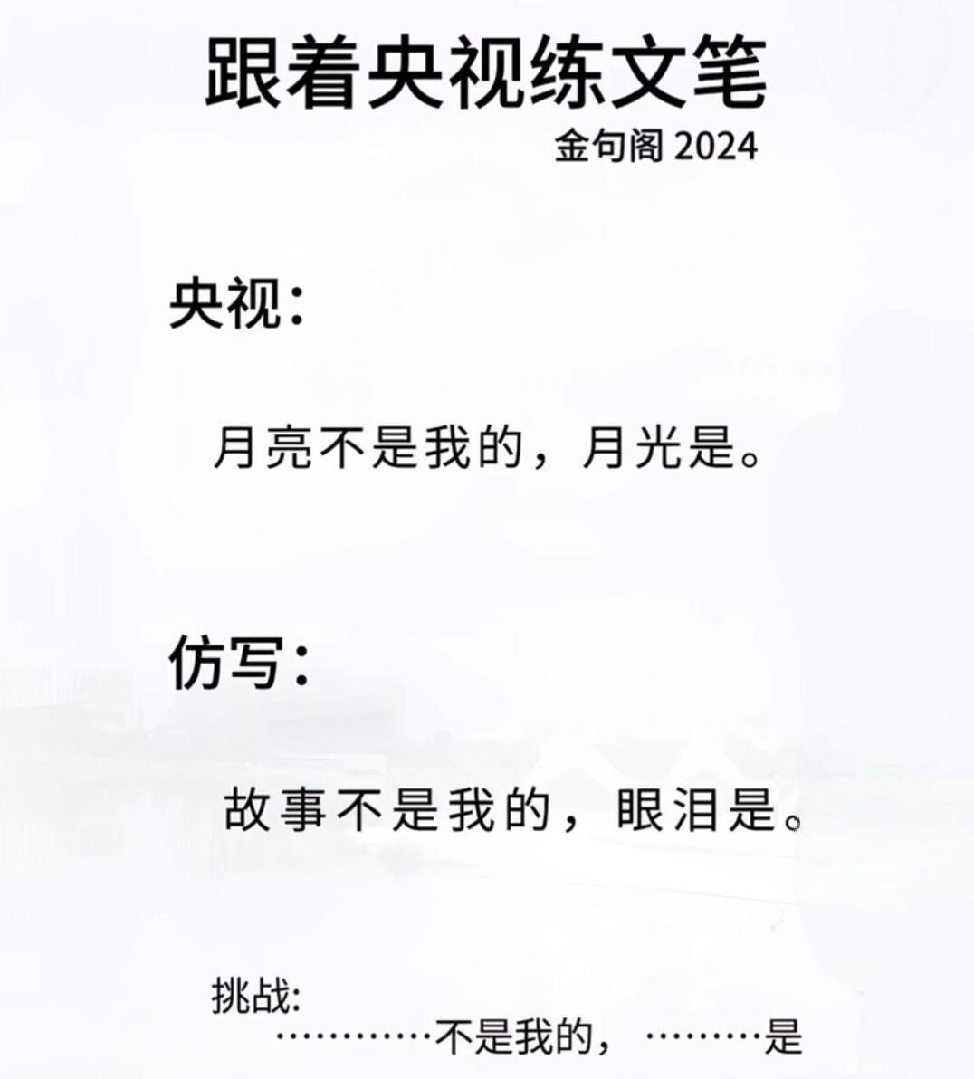 I particularly like your “文章不是我的,流量是” and the reverse ones like “收获不是我的,付出是.” They are very poignant and capture a lot of modern sentiments. Keep up the great creative thinking! What other challenges would you like to explore?