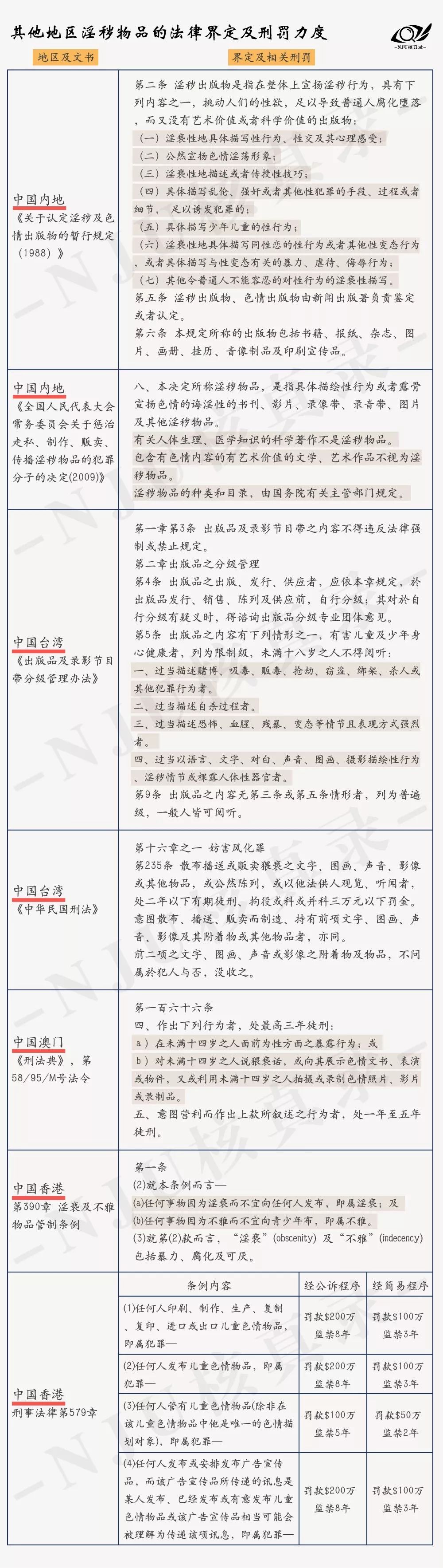 在中国内地和港澳台地区的法律条文中对于“淫秽”及“色情”出版物的界定不同,对此类违法行为的刑罚也有所不同。