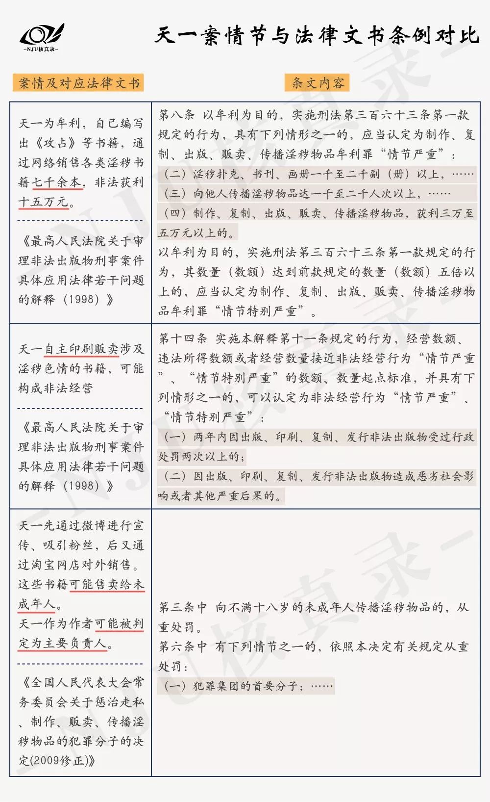 对于制作和贩卖淫秽书刊案件,《最高人民法院关于审理非法出版物刑事案件具体应用法律若干问题的解释(1998)》以出版刊物的数量和违法所得金额为依据划定情节的严重程度,天一案依照这一依据可以被划定为“情节严重”甚至“情节特别严重”,被判处较长的刑期。