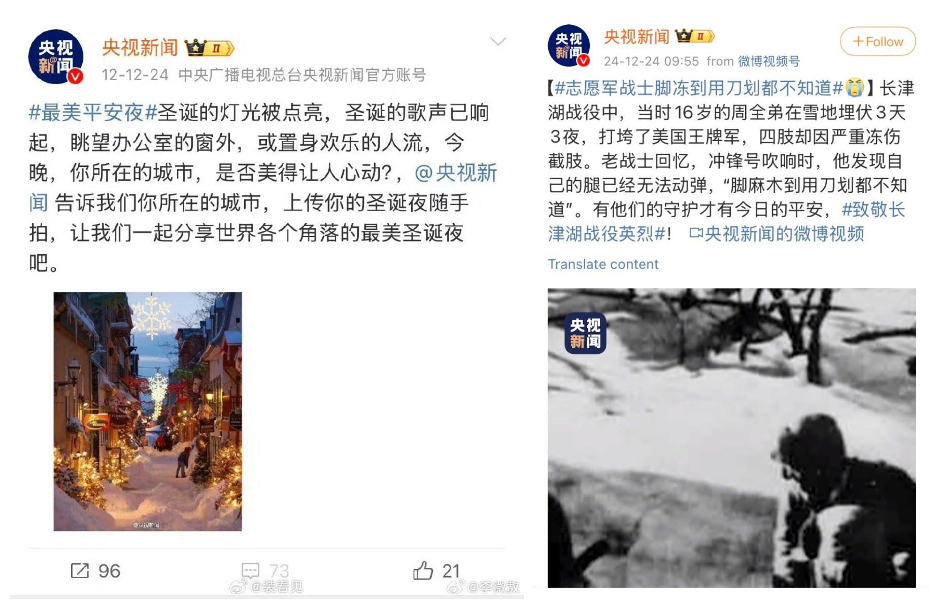 Images: These show various official Chinese media outlets (CCTV, People’s Daily, Xinhua) covering both Christmas-related content and content related to the Korean War (specifically the Battle of Changjin Lake).