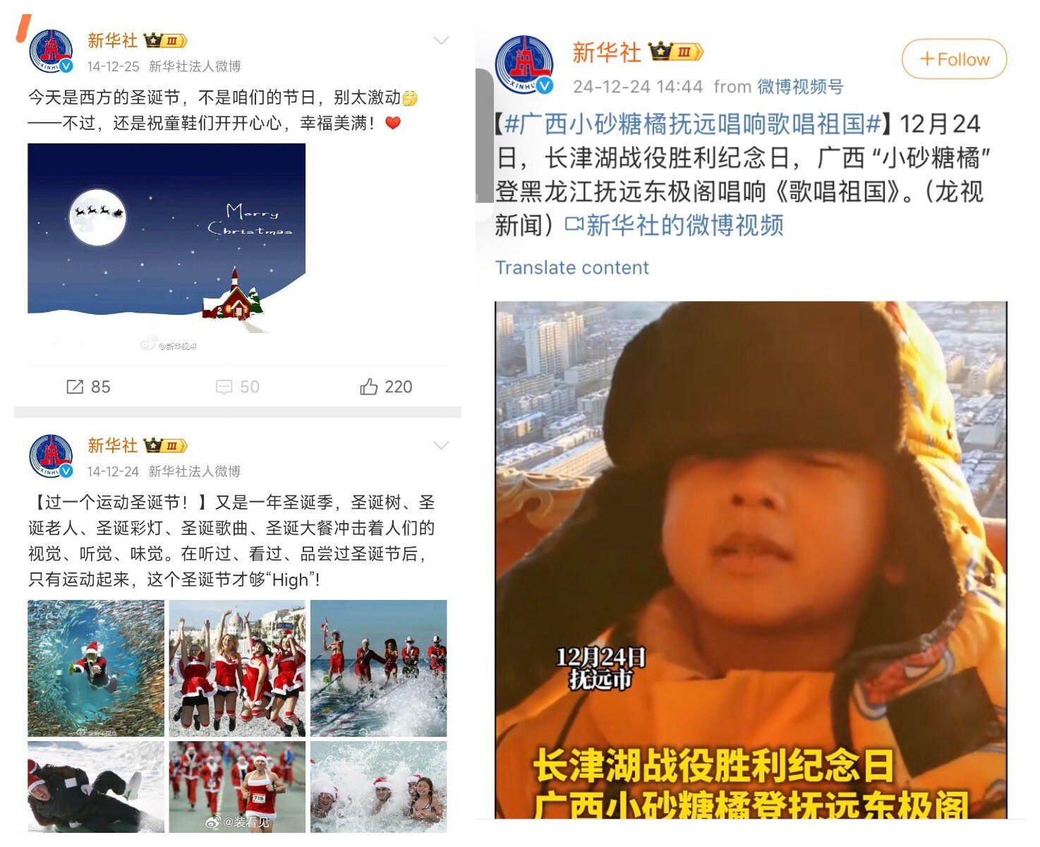 Xinhua: Includes a generic “Merry Christmas” message and a video about a Korean War commemoration event. It also has a post describing Christmas as a “foreign festival” and suggesting activities to “make it High”.