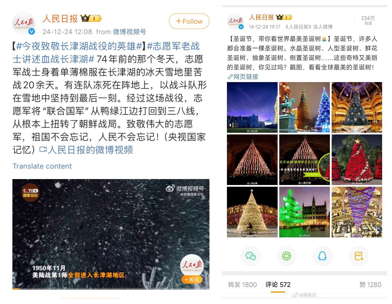 People’s Daily: Features a post showcasing beautiful Christmas trees worldwide and another commemorating the Battle of Changjin Lake.