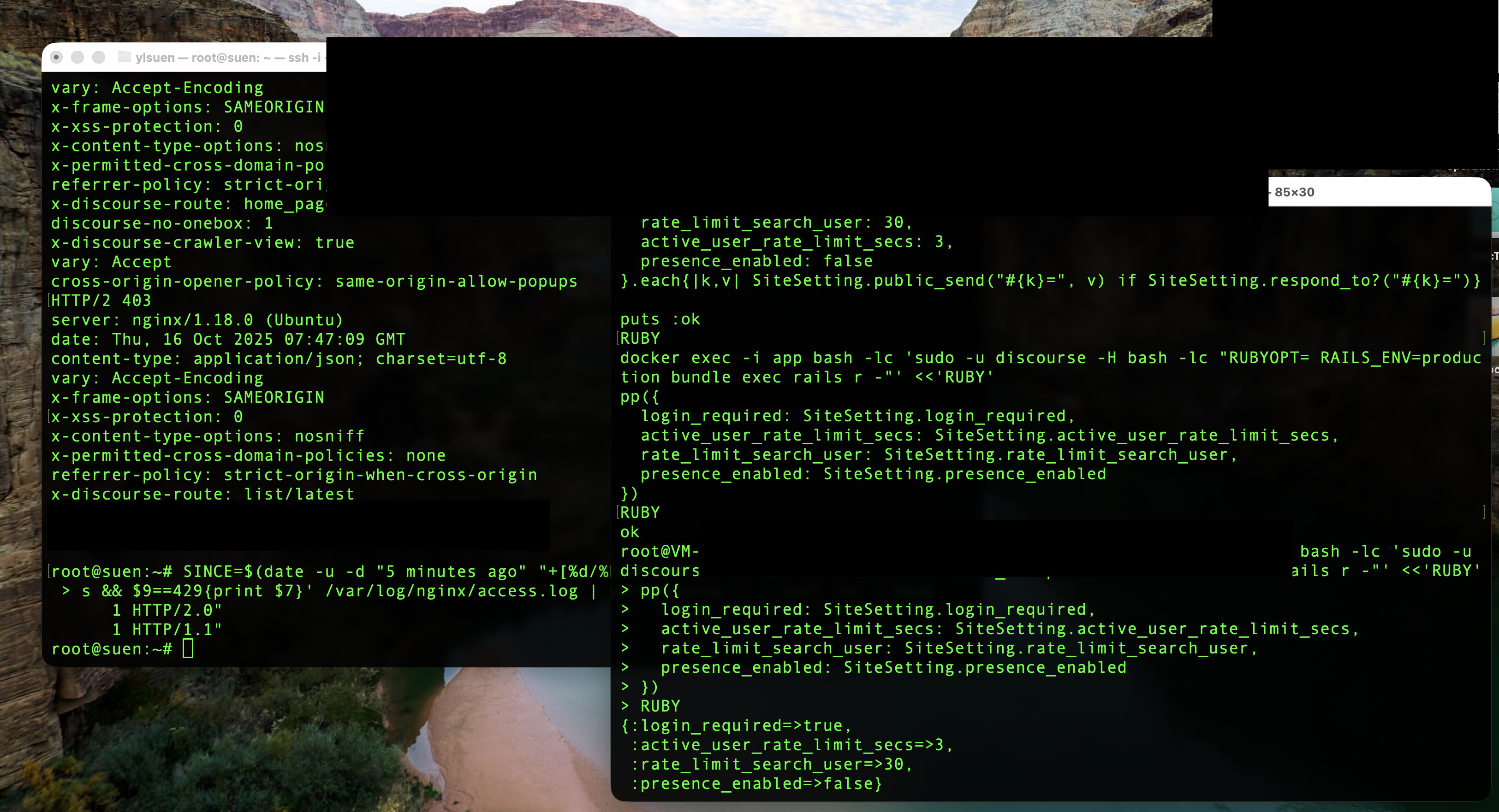 已把影響讀場景的值調寬(活躍 3 秒、搜尋 30 秒、presence 關閉),此後即便在 NAT/高併發讀,應該也不會再把正常請求打成 429了。