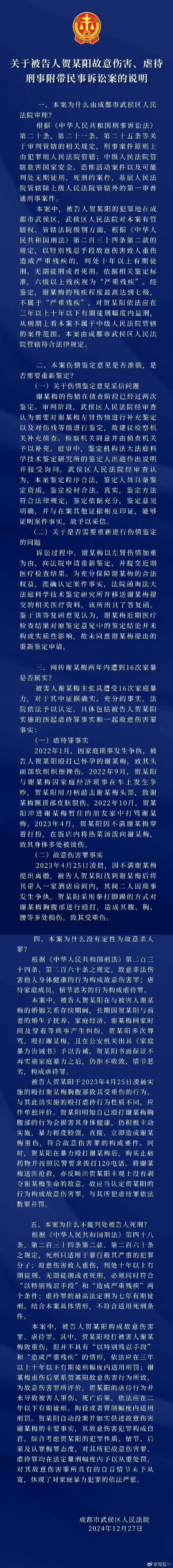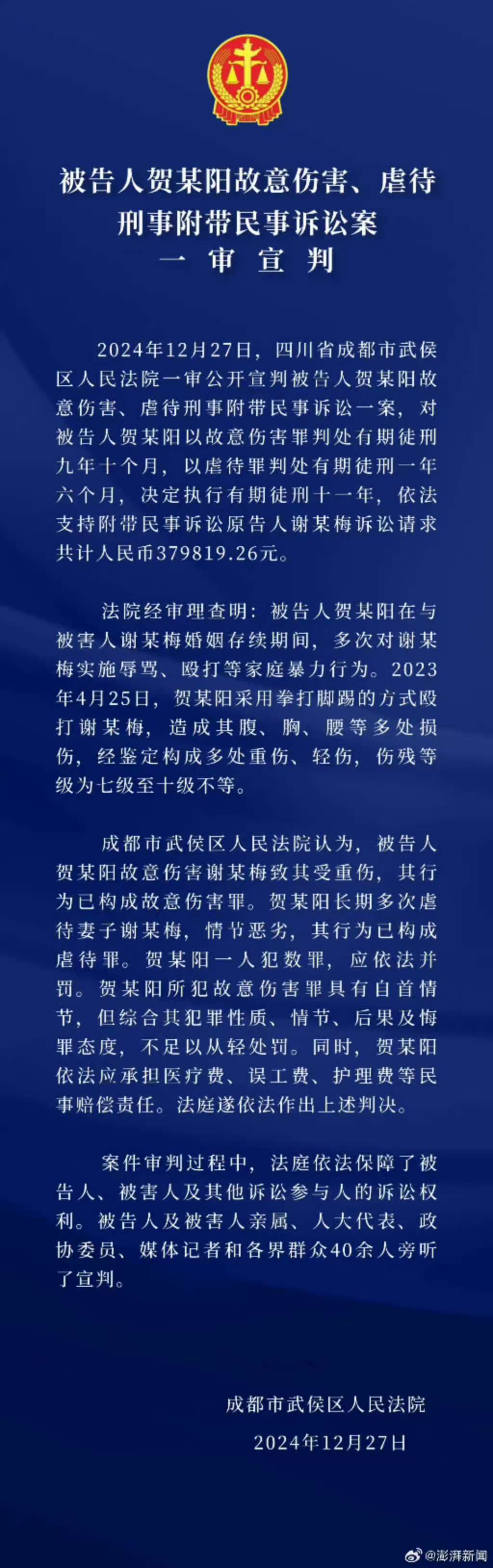 12月27日下午,四川省成都市武侯区人民法院对“成都女子两年遭遇多次家暴”一案作出一审判决:对被告人贺某阳以故意伤害罪判处有期徒刑9年10个月,以虐待罪判处有期徒刑1年6个月,决定执行有期徒刑11年,依法支持附带民事诉讼原告人谢某梅诉讼请求共计人民币379819.26元。
