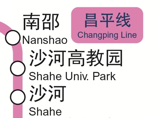 沙河高教园站位于粉红色的昌平线上。根据图像,我们可以看到: