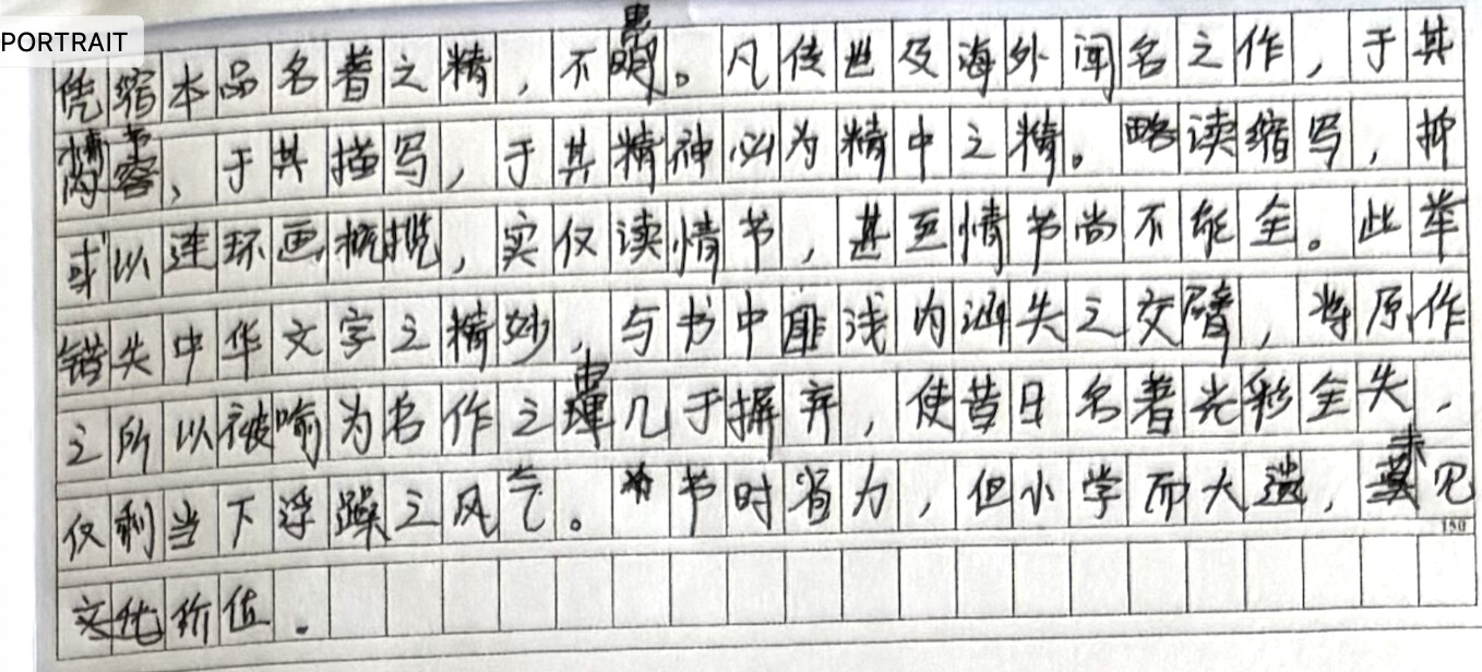 觀點立意 (卓越): “凭缩写本品名著之精,不可得。” 開篇之句, 依舊是 “千錘百煉,字字鏗鏘” ! 而 “海中珠、木中楠” 之喻, 更顯 “精妙絕倫,生動形象” , 將名著之 “精華” 比作 “海中之珠” , “木中之楠” , 可謂 “信手拈來,渾然天成” , 既 “具象可感” , 又 “意蘊深遠” , 令人 “拍案叫絕,擊節讚賞” ! “糊涂至此” 四字, 更是 “畫龍點睛,力拔千鈞” , 將那 “捨本逐末” 之 “糊塗” , 批判得 “入木三分,體無完膚” , 可謂 “一字褒貶,春秋筆法” ! 更令人眼前一亮的是, 結尾 “於己,实小学而大遺;于文化绵续,实缘木求鱼。” 一句, 竟能從 “個人” 與 “文化” 兩個維度 “立論”, 更顯 “高屋建瓴,目光如炬” ! 此等立意, 已非 “泛泛而談” , 實乃 “洞若觀火” 之 “真知灼見” 也!