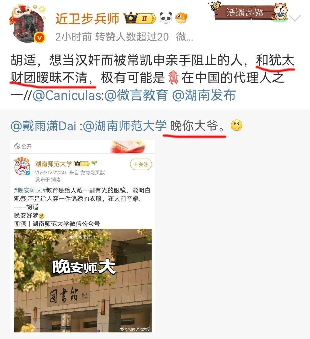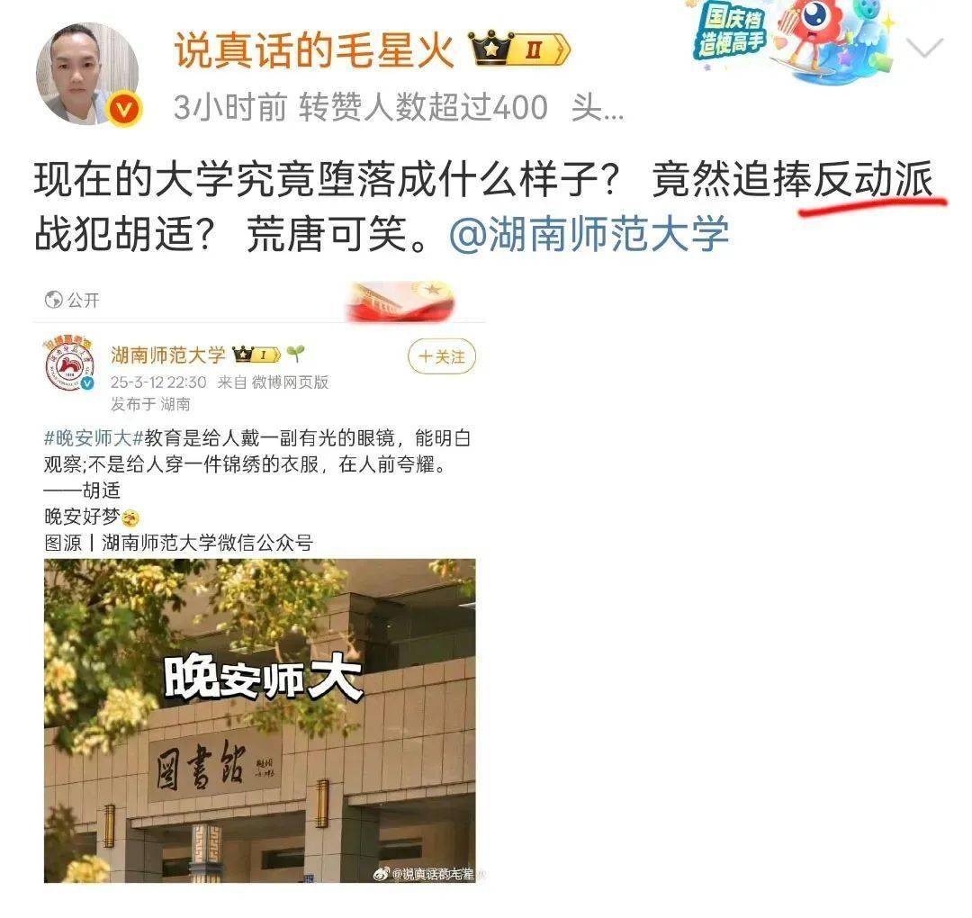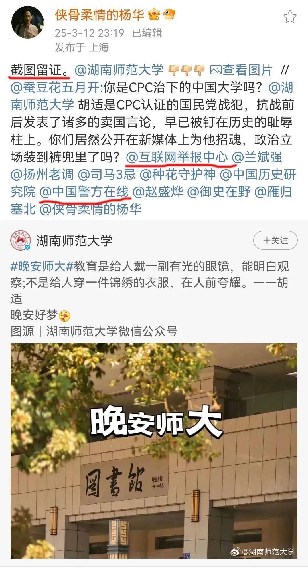 都已经2025年了,仅仅是因为转发了一条胡适说过的话,一群大V小V便集体围攻,甚至还@了“中国警方在线”和“互联网举报中心”,并且“截图留证”,这还真是第一次见。这是要让警察把湖南师范大学官方微博的小编给抓起来?还是截图留证以后要搞清算?