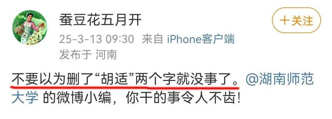 我刚刚又去看了一眼湖南师范大学的官方微博时,很意外地发现,湖南师范大学的官方微博做了修改,去掉了“胡适”两个字。
