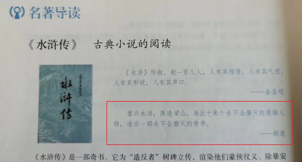 但是,这次“二落”还不彻底,胡适还有一句话被遗漏在教材中,那就是他对《水浒传》的点评。2022年,部编版语文教材进一步做了修订,胡适留在教材中的最后一句话终于被揪了出来,那个叫胡适之的人,从中小学教材中再一次彻底消失了。