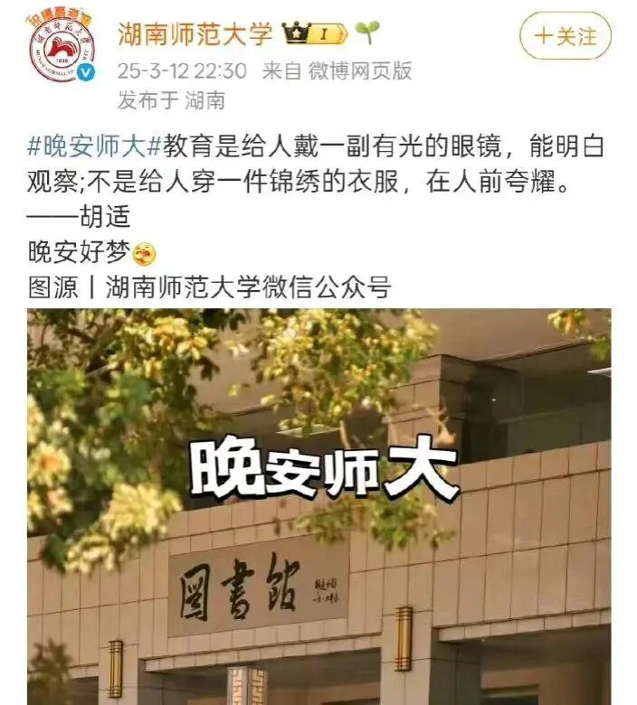 3月12日,湖南师范大学官方微博发出一条晚安祝词:“教育是给人戴一副有光的眼镜,能明白观察;不是给人穿一件锦绣的衣服,在人前夸耀。”