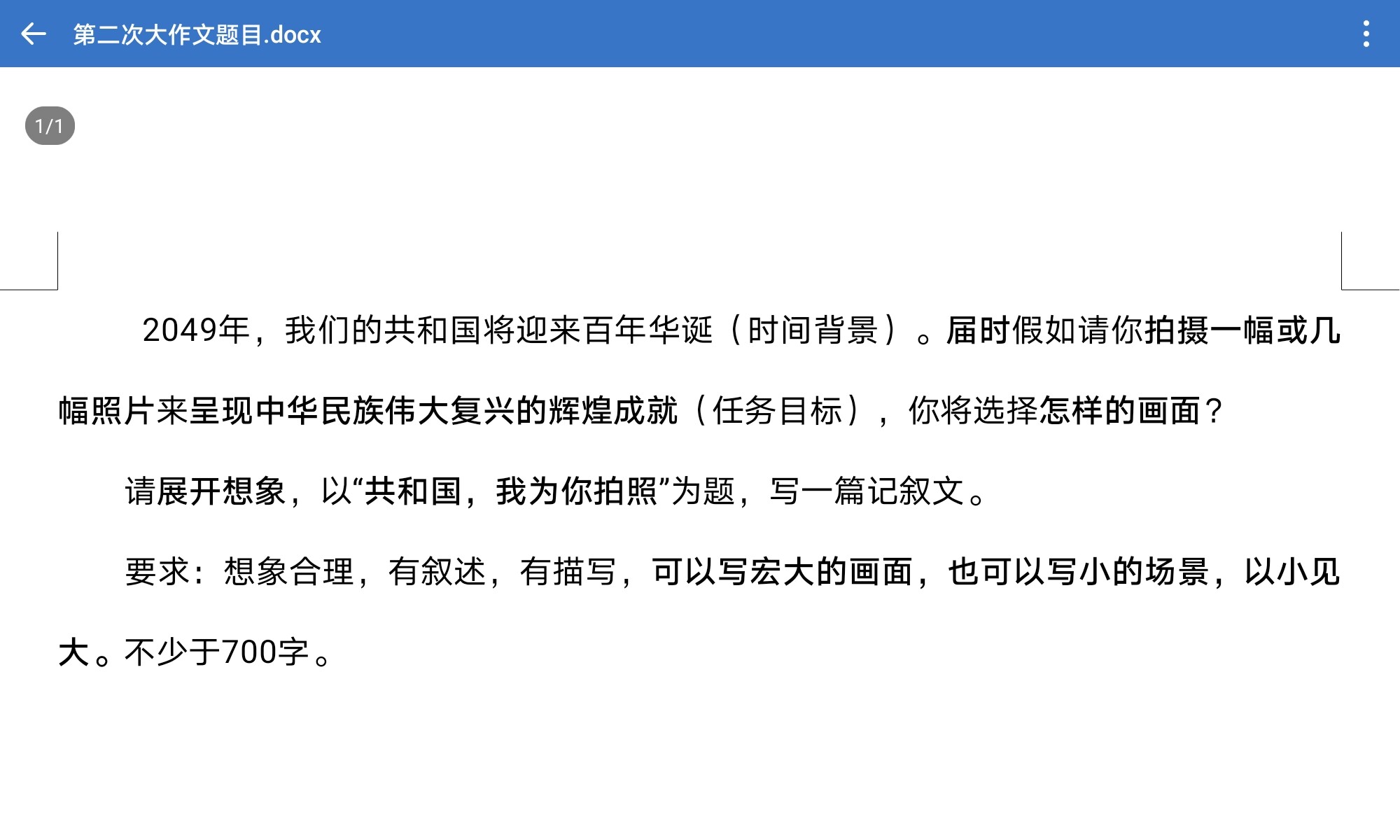 要完成题目要求的“共和国,我为你拍照”这篇700字以上的记叙文,还需要围绕这个(或者其他的)选定的画面,展开更丰富的想象、叙述和描写。