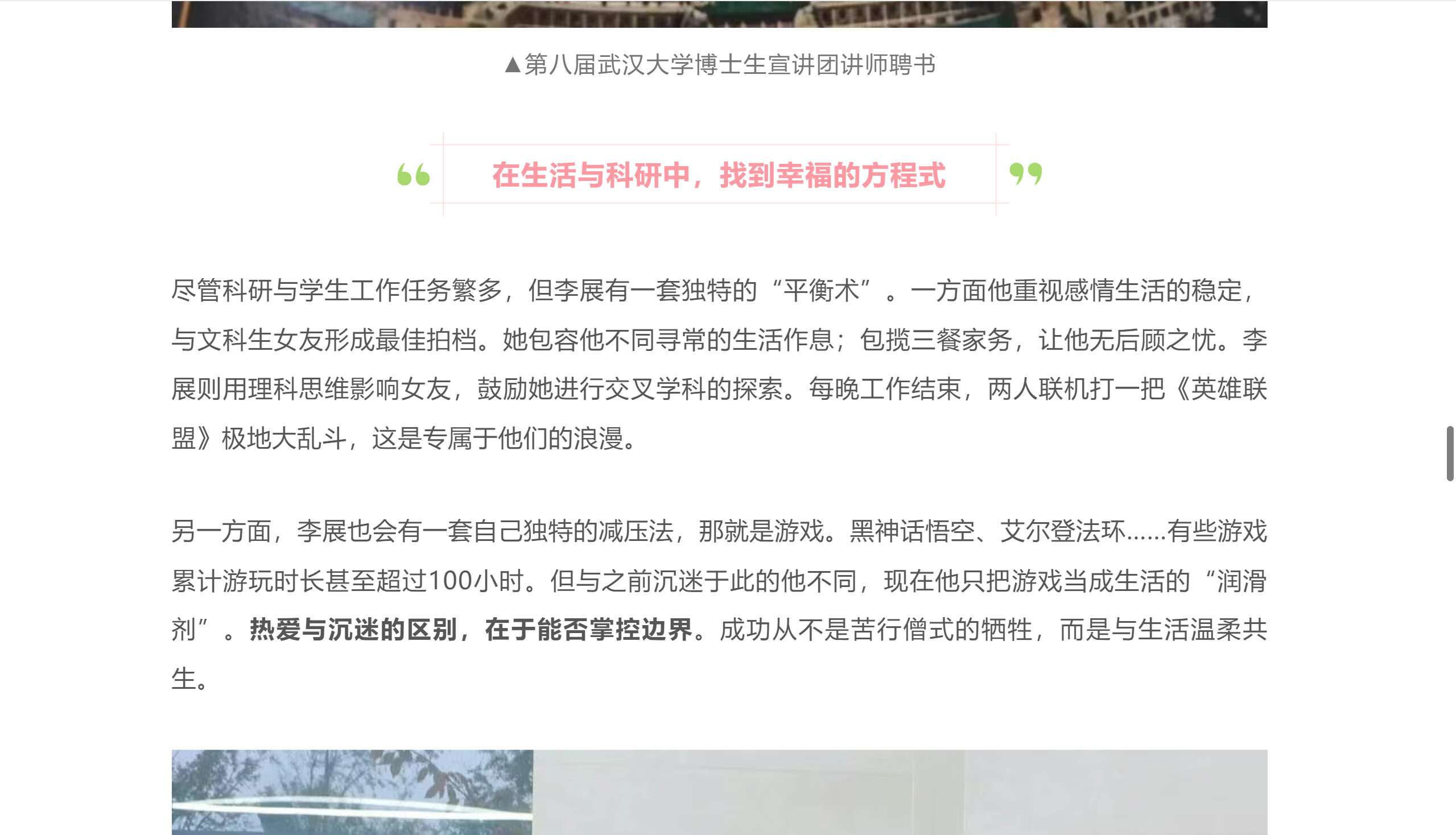 这篇文章是一篇典型的人物宣传稿,旨在塑造武汉大学博士生李展的正面形象——一个从低谷(沉迷游戏、绩点低)逆袭成为学术新星(顶刊作者、竞赛获奖)的励志榜样。文章结构清晰,叙事流畅,通过对比(过去与现在)、关键转折点(遇到常胜教授)、具体成就(论文发表、竞赛获奖)等元素,成功地构建了一个“浪子回头”、通过努力和坚持取得成功的叙事。文章也试图展现李展全面发展的一面,比如参与社会服务(博士生宣讲团)、以及所谓的“生活与科研的平衡”。