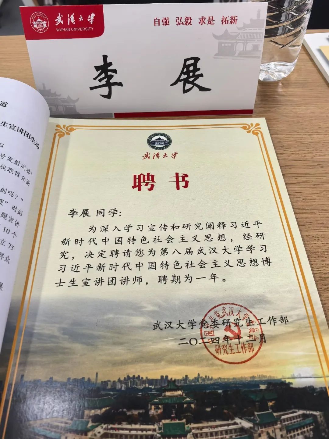 ▲第八届武汉大学博士生宣讲团讲师聘书