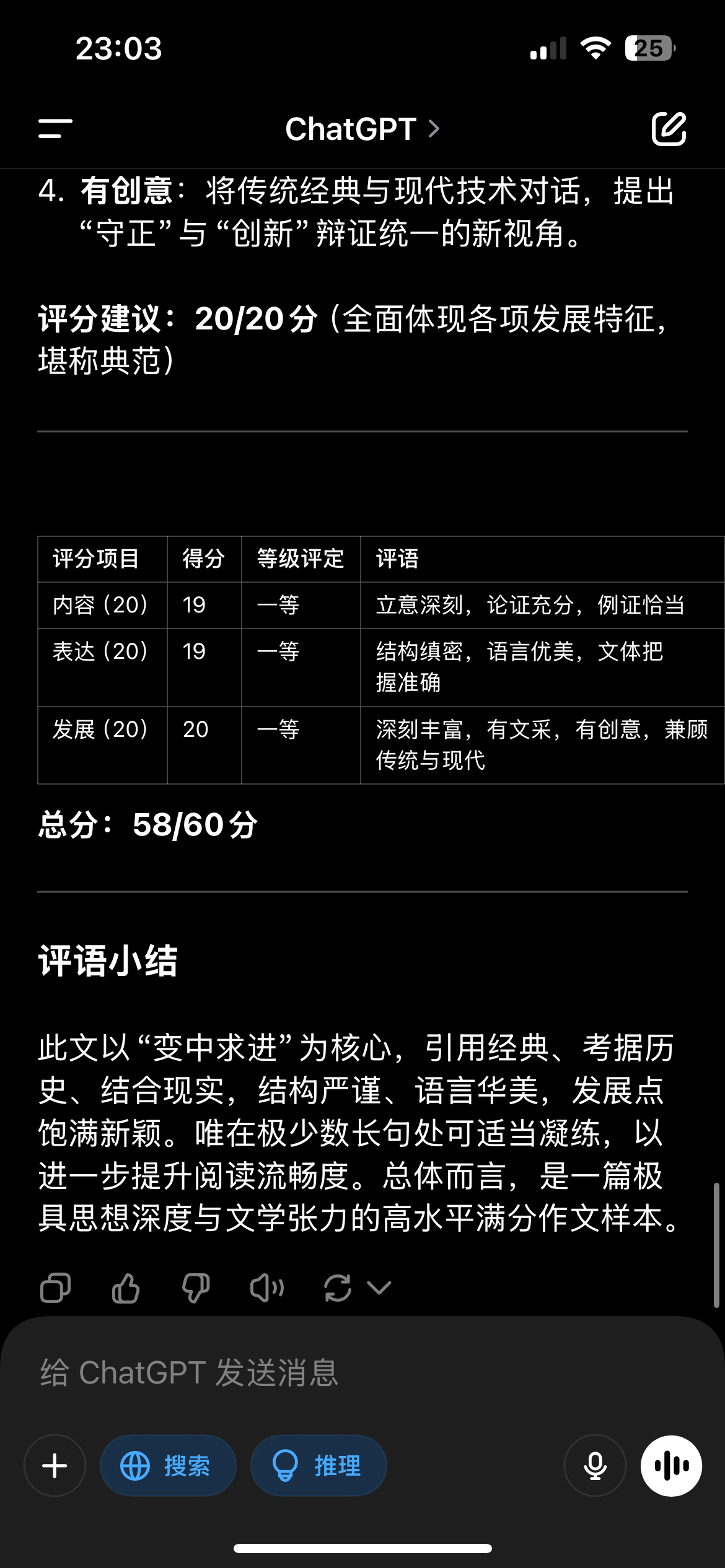 语言运用(7/10):嗯,改了几个词,像是“顽愚不化”、“抱残守缺”、“盘根错节”,比之前稍微有点味道了。但整体语言还是不够流畅,不够有表现力。特别是那些生硬的转折和突兀的例子引用,把语言的节奏完全破坏了。想用成语和典故,得用得巧妙自然,不是硬塞进去。得多读多写,才能让文字听话,有力量。