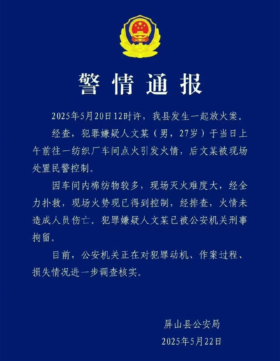 屏山警方警情通报:于5月20日12时许发生在屏山县的火灾是一起放火案。经查,犯罪嫌疑人文某(男,27岁)于当日上午前往一纺织厂车间点火引发火情,后文某被现场处置民警控制。