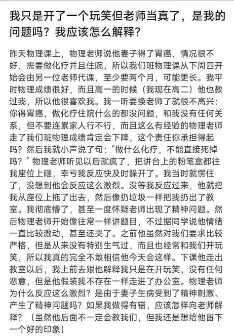 这哪里是玩笑?这简直是… 难以置信的冷血和缺乏同理心。老师妻子的生命正在遭受威胁,他却能说出这样的话,甚至还反问是不是自己的问题。