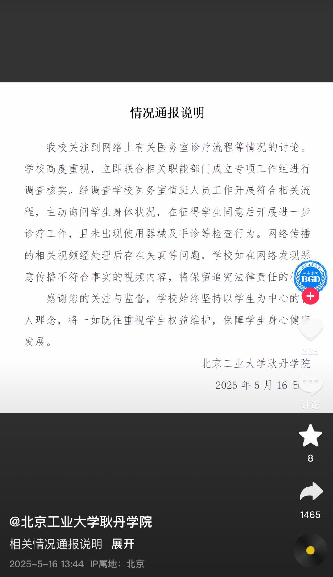 生理期不适去校医室开假条,竟被要求脱裤子证明——近日,北京工业大学耿丹学院一名女生的遭遇引发舆论关注。5月16日,涉事高校发布情况通报称,经调查,学校医务室值班人员工作开展符合相关流程,主动询问学生身体状况,在征得学生同意后开展进一步诊疗工作,且未出现使用器械及手诊等检查行为。