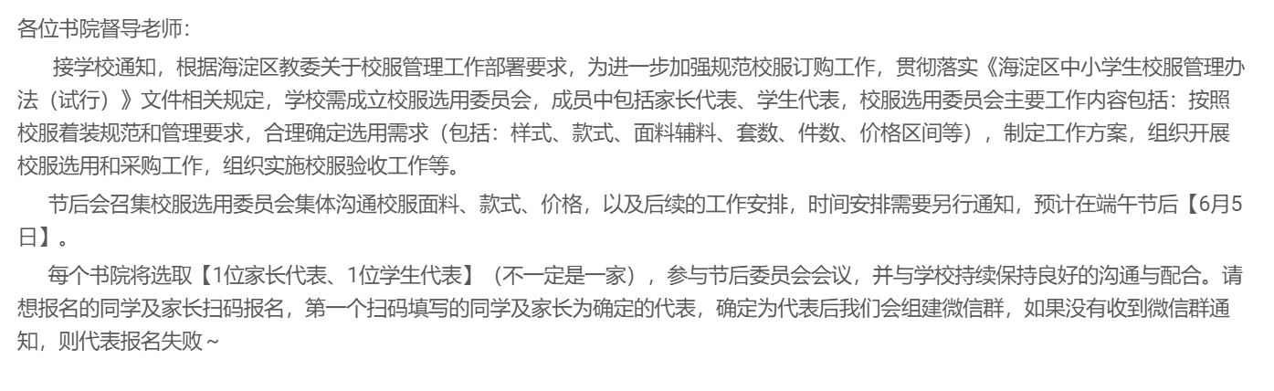 接学校通知,根据海淀区教委关于校服管理工作部署要求,为进一步加强规范校服订购工作,贯彻落实《海淀区中小学生校服管理办