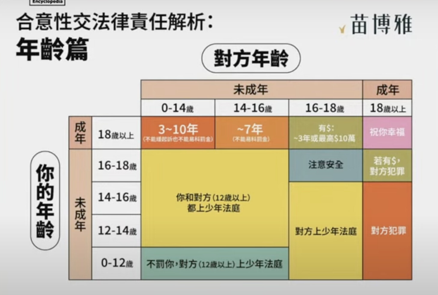 總結來說,中國大陸在保護未成年人方面,最大的不同點是對於14周歲以下的未成年人有著非常嚴格的「一律推定強姦」規定。而對於14-18周歲的未成年人,法律的側重點則更多放在是否存在「暴力、脅迫」或「利用特殊關係」等強制性或剝削性的情況上,而不是像台灣圖表中那樣,對「合意」但存在年齡差距的特定情況給出詳細的刑期區間。