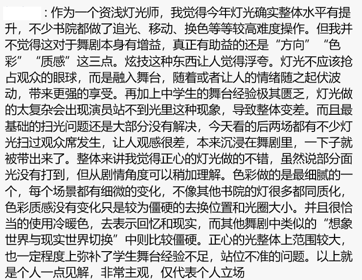 从舞蹈来讲呢,相对单调重复,让我这种零基础观众感觉无趣。灯光等相对同质化,没有让人耳目一新的感觉。