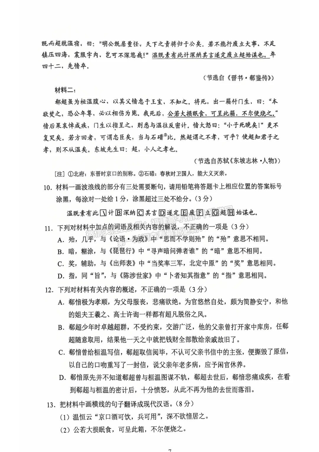 A white document covered in dense Chinese text, likely an exam paper or textbook page, is shown with various paragraphs and numbered questions. (Captioned by AI)