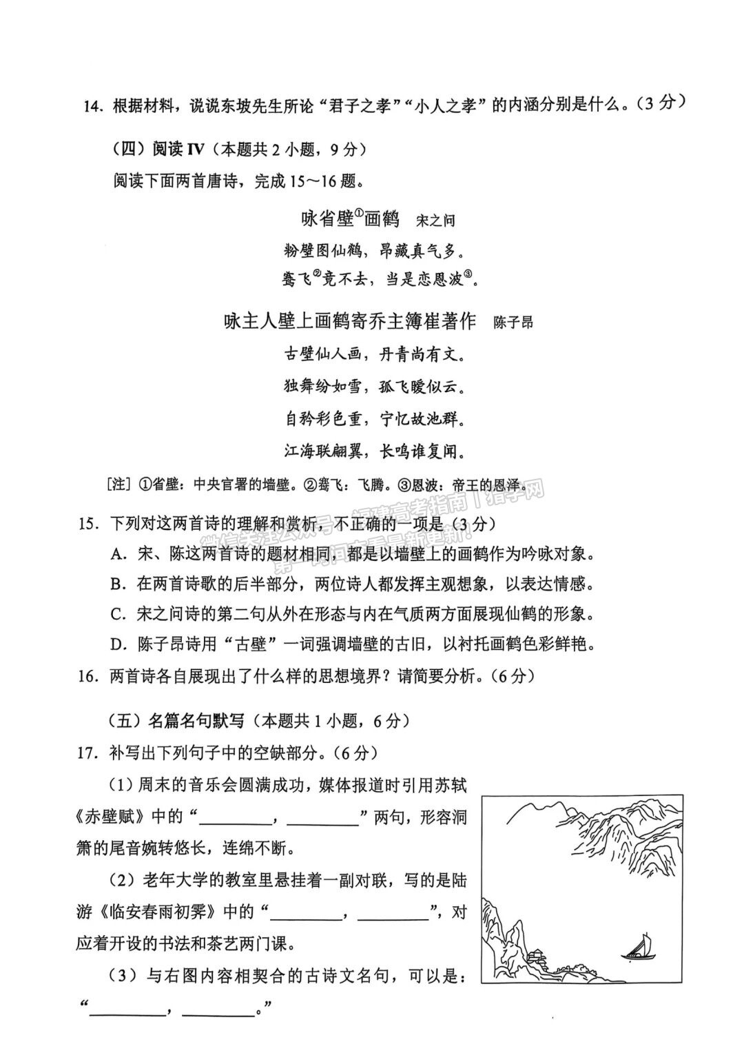 A white document displays Chinese text questions, including two poems and comprehension tasks, alongside a small line-art illustration of a boat sailing on water near mountains. (Captioned by AI)