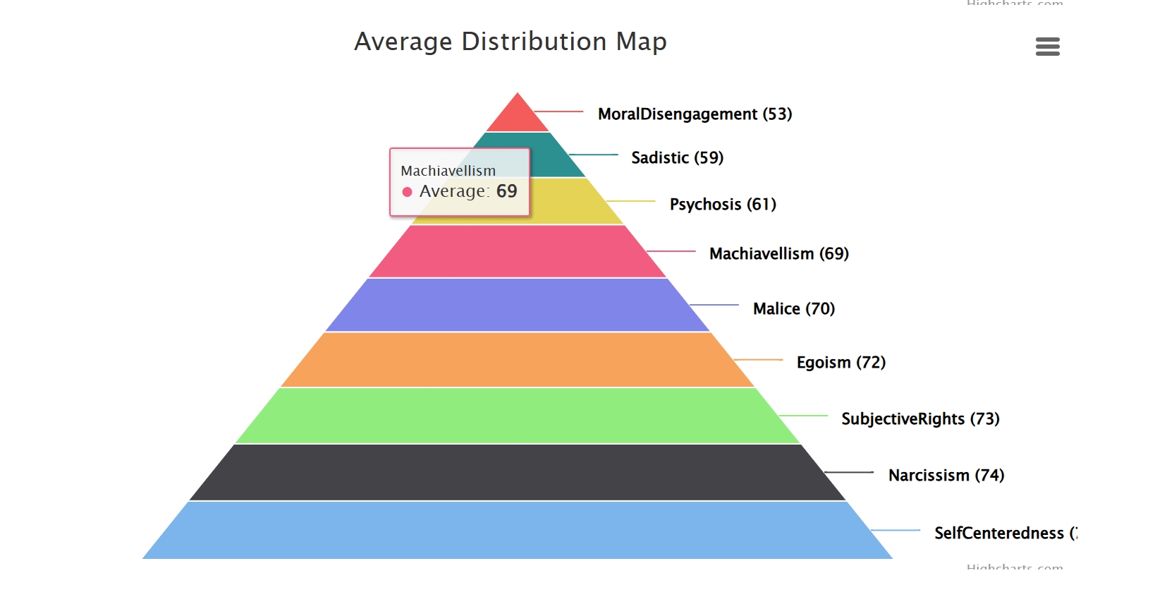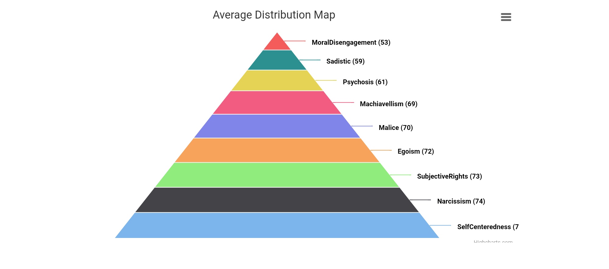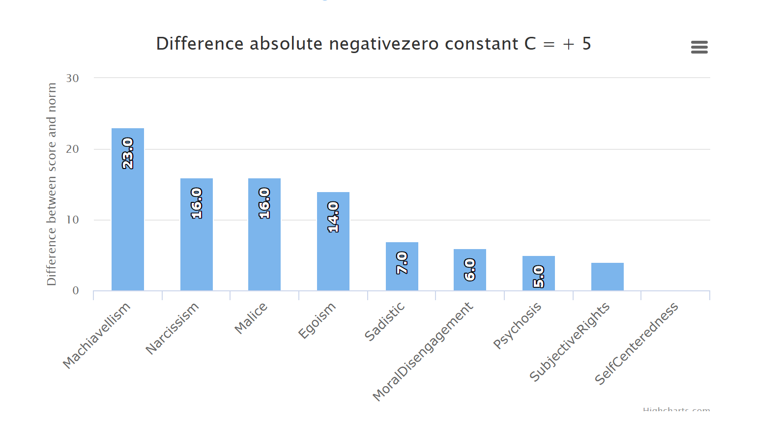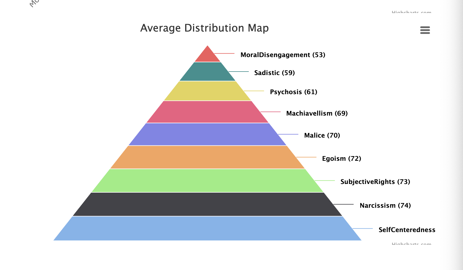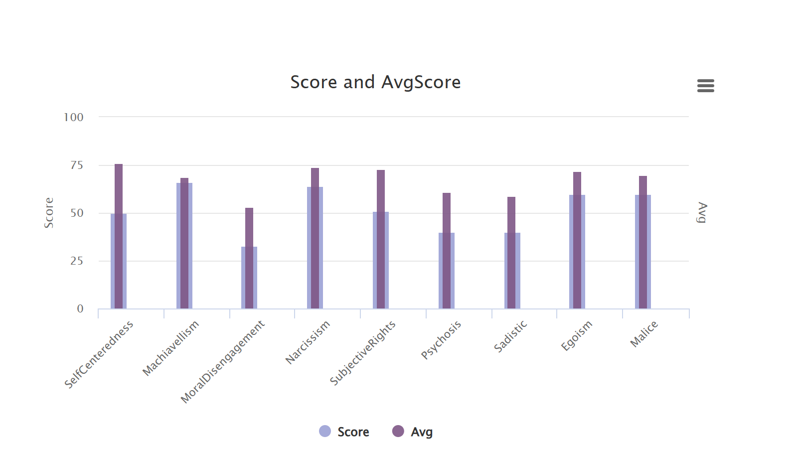 核心特點:您在「主觀權利感」和「利己主義」上得分極高,在「馬基雅維利主義」和「自戀」上也呈現較高傾向。同時,您在「精神變態」、「惡意」、「施虐」和「自我中心」方面得分顯著或明顯低於平均,顯示出這些黑暗特質較不突出。