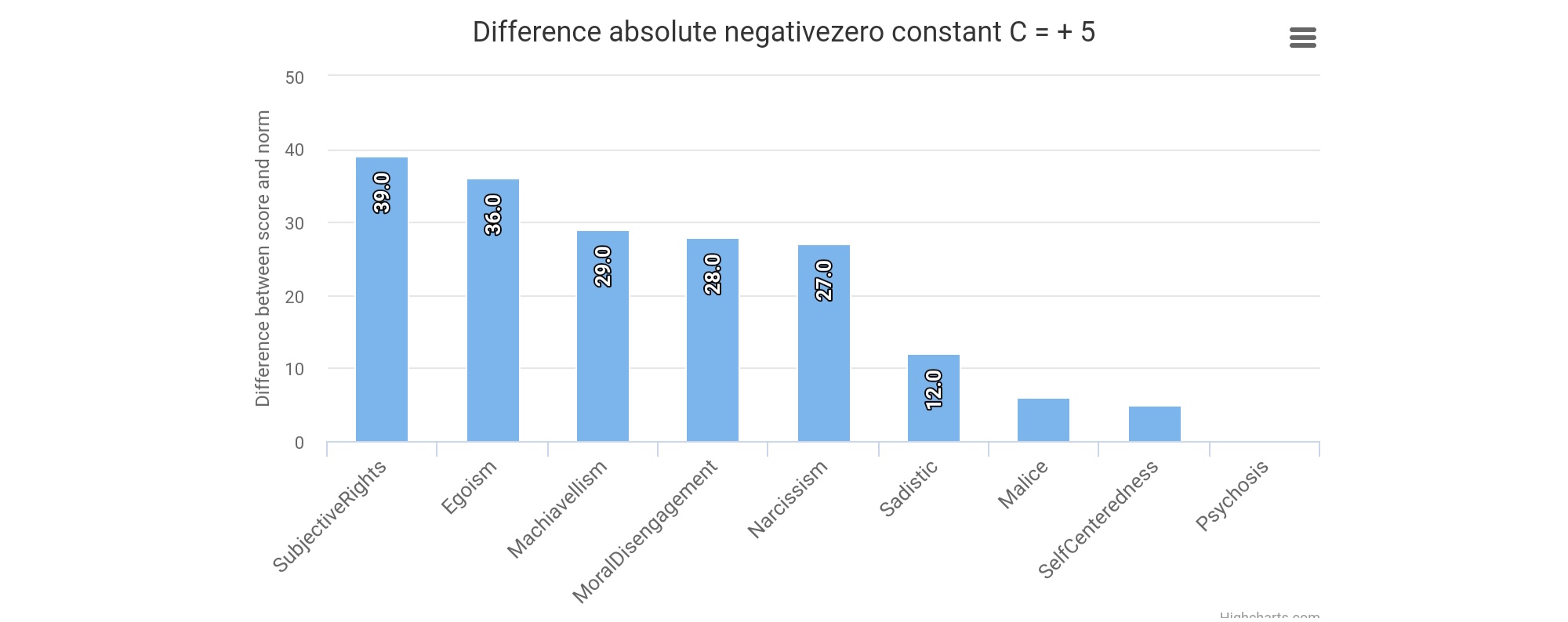 在不影響自身利益時表現出合作或友善: 因為自我中心分數低,他們可能在表面上表現得友好、有禮貌,甚至能顧及他人的感受——只要這不與他們的核心利益發生衝突。一旦涉及到他們的根本利益,高利己主義和主觀權利感就會驅使他們做出對自己最有利的選擇。