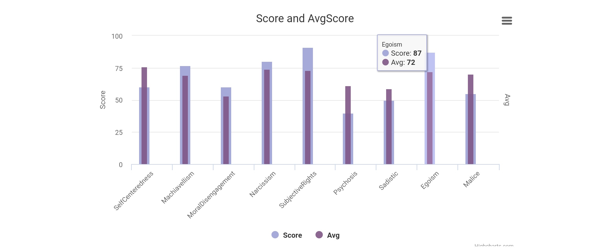 您的「黑暗核心人格」特質分數分析 (基於「Score and AvgScore」圖表):