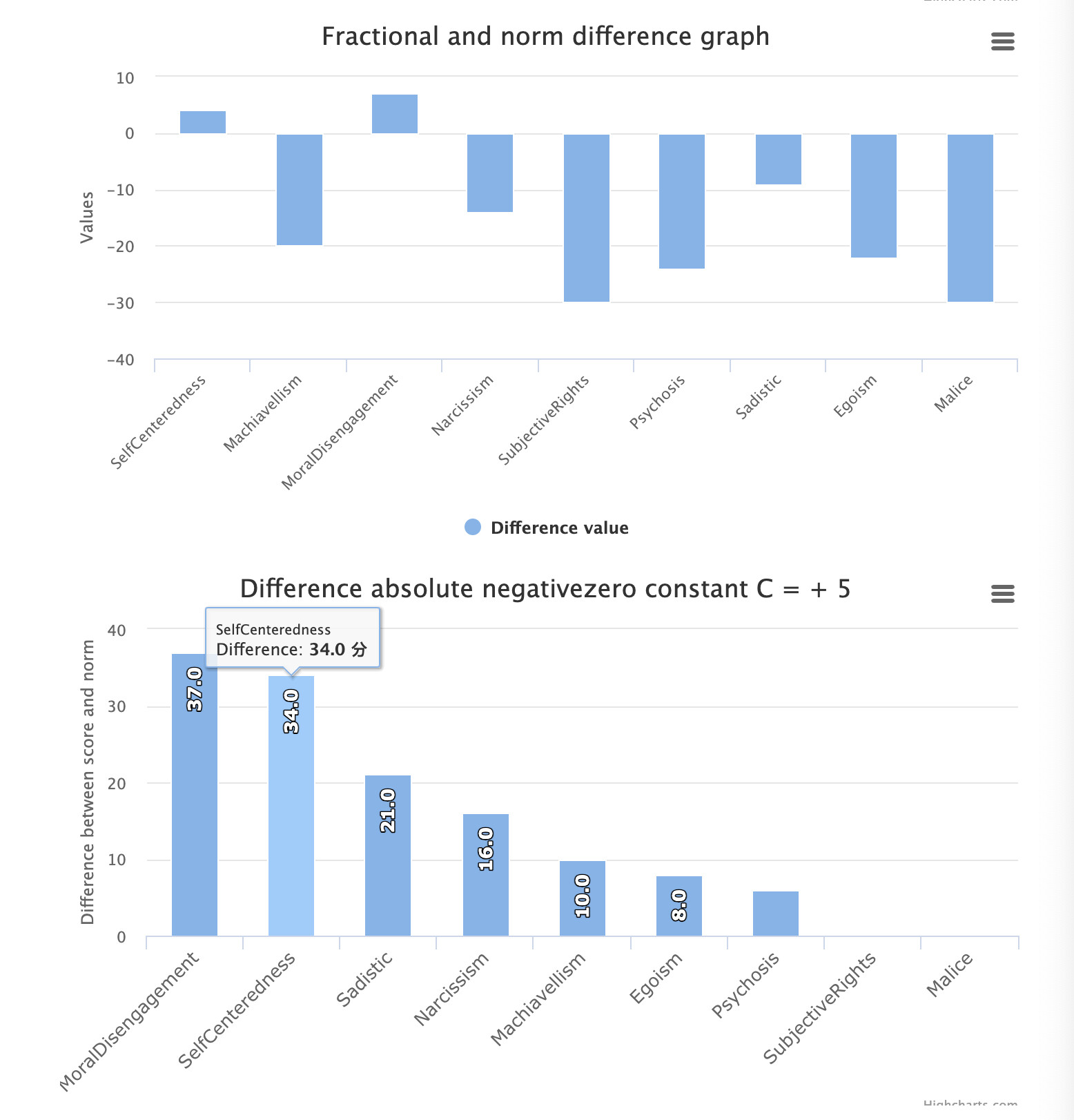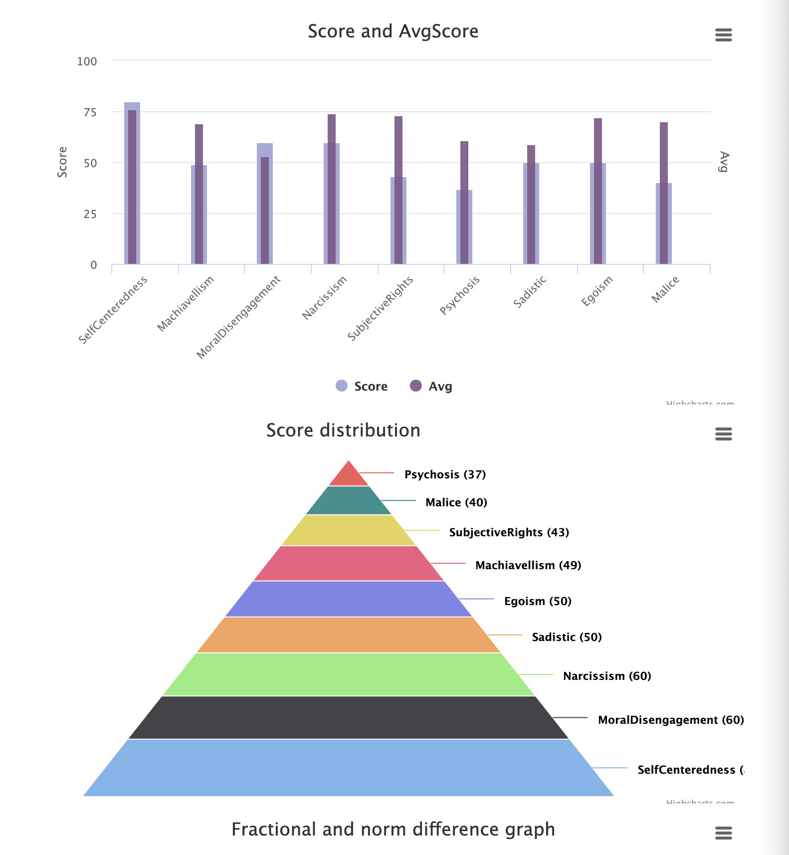 根據第一張圖的數據,您的多項「黑暗核心人格」特質,包括自我中心、馬基雅維利主義、自戀、利己主義和惡意,都顯示出高於平均水平的趨勢。而主觀權利感和精神變態相關特質則低於平均水平。道德脫離和施虐與平均水平相近。